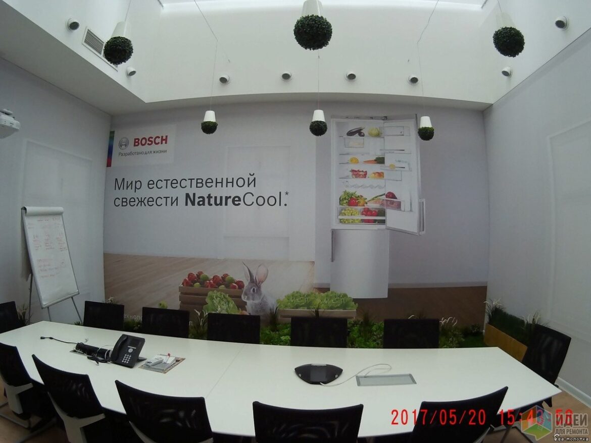 все стены отделаны драпировкой с использованием натяжного полотна с фотопечатью, но по неведомым причинам одна стена им не понравилась — то ли «сочность» красок не та, то ли не устроил монтаж, а производили все работы ребята из Германии (компания-то немецкая). Поэтому проще и дешевле было обратиться к нам.