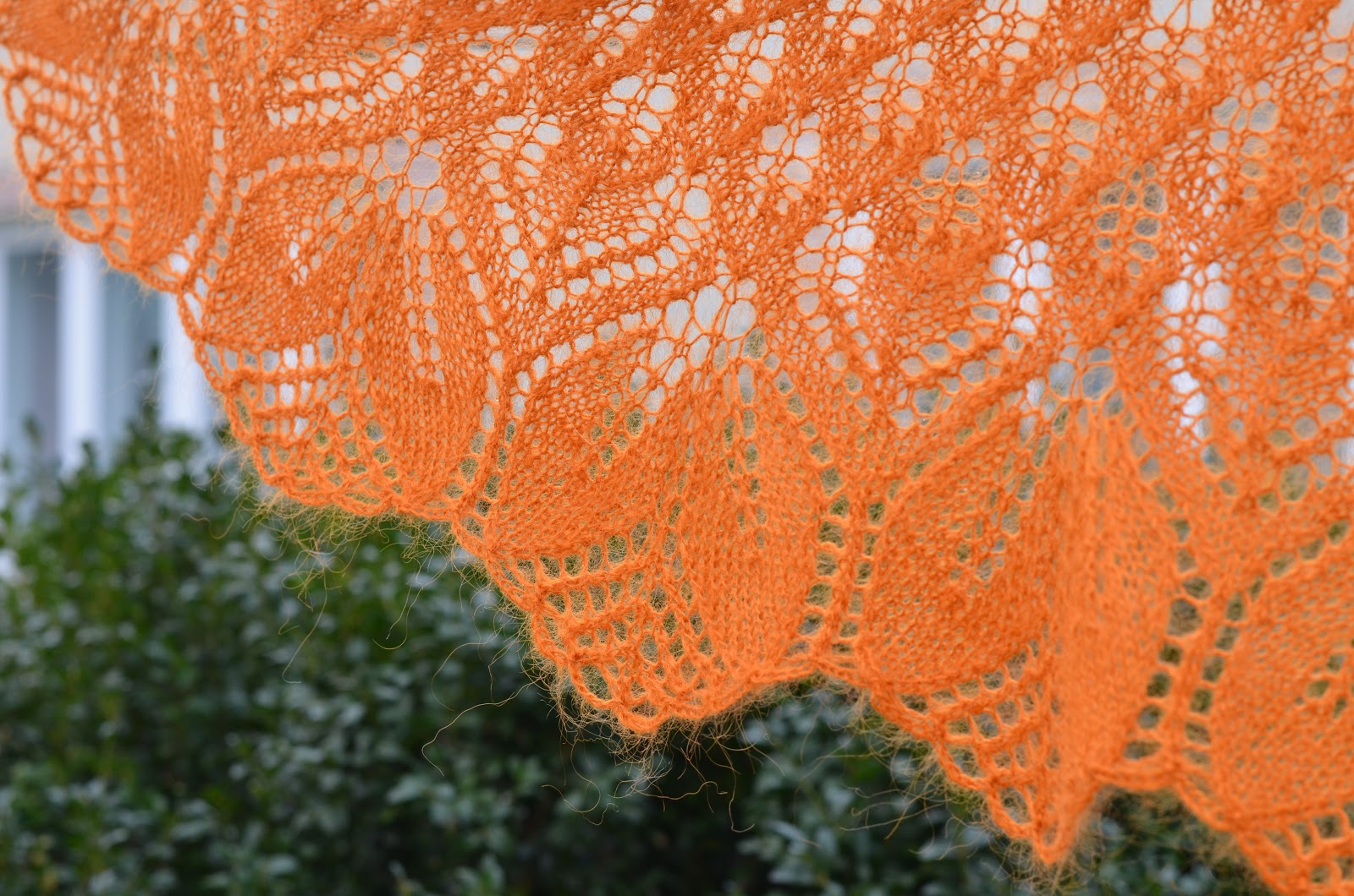 Ажурный узор шали состоит из уменьшенной версии узора «папоротник» и богатой лиственной каймы по краям.