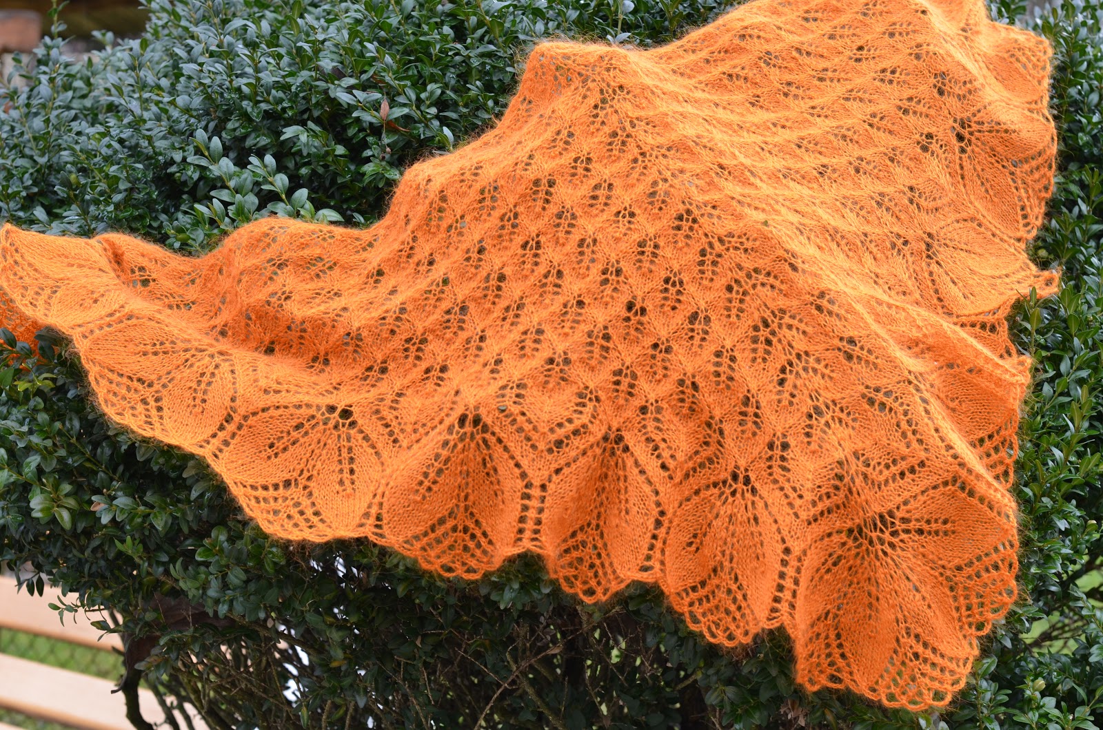 Также обратим ваше внимание на то, что на пышный лиственный узор уходит в среднем половина всей пряжи. Имейте это в виду при расчете размера шали.