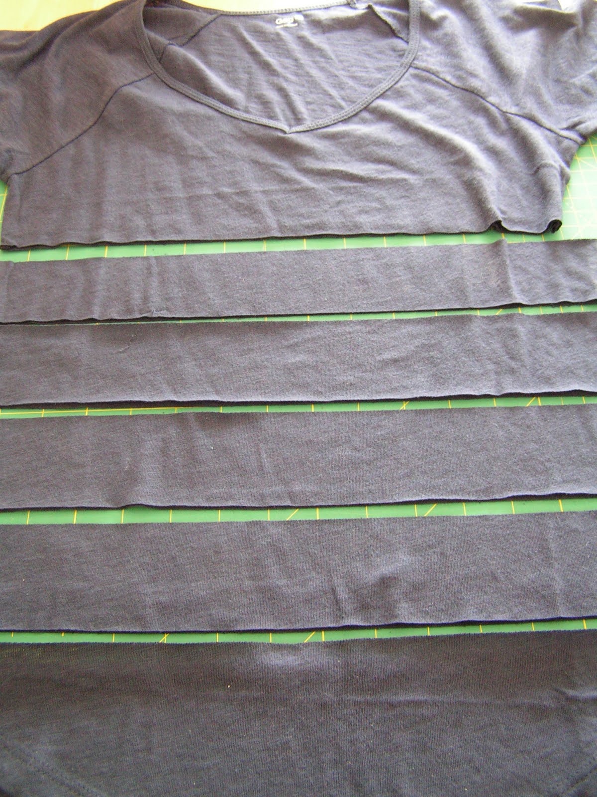 1. Первую футболку разрезаем на полоски 10 сантиметров шириной.